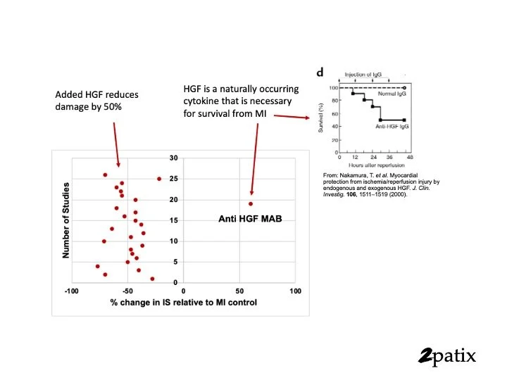 Numerous studies document the protective and regenerative properties of HGF on cardiomyocytes and endothelial cells. The figure shows a compilation of 25 individual studies examining the effect of HGF on myocardial infarction. These studies examined mice (4 studies), dogs (1), rats (13), rabbits (1) and pigs (6). HGF was delivered as recombinant HGF (4), adenovirus (7), plasmid (7), HGF transfected MSCs (7), a transgenic mouse (1) and an anti HGF monoclonal antibody. Significant reduction in infarct size (IS) was found in each case as was an increase in ejection fraction and an increase in angiogenesis when reported.